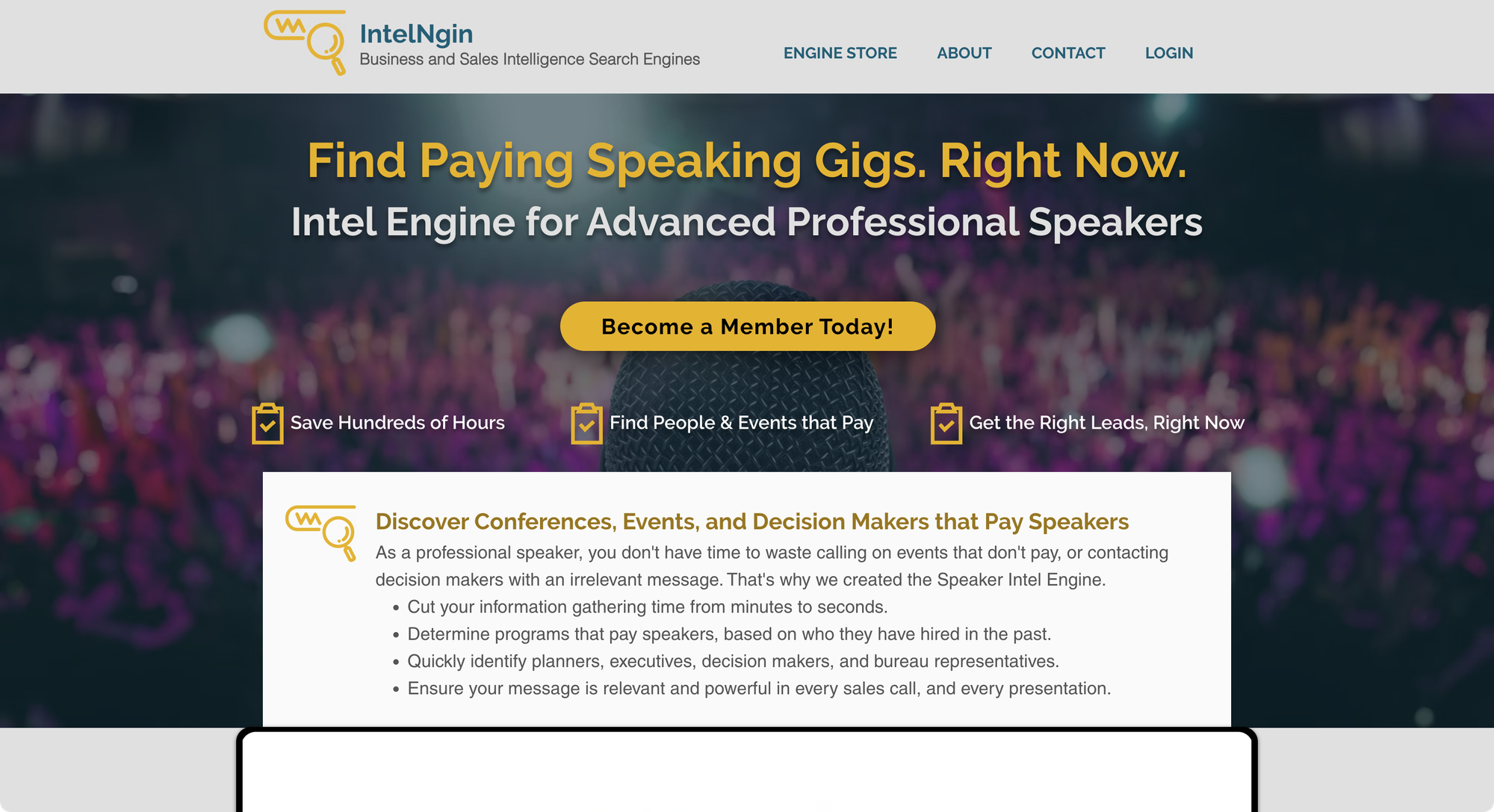 His system is designed to help members find speaking opportunities more efficiently. The Intel Engine isn not a database or a list-building tool. Instead, you can think of it as a search engine overlay.