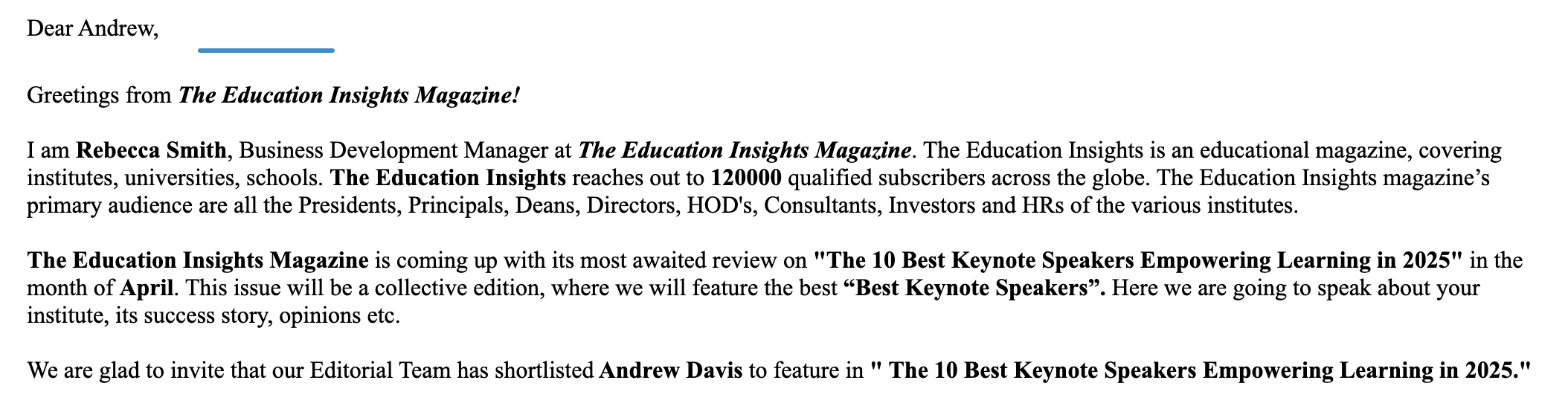 “You’ve been selected as one of the most influential keynote speakers to watch in 2025!”