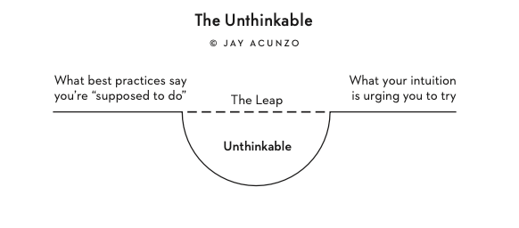 Caption: Jay Acunzo’s model entitled The Unthinkable helps him show organizations how to leap from following the best practices to trusting their intuition.