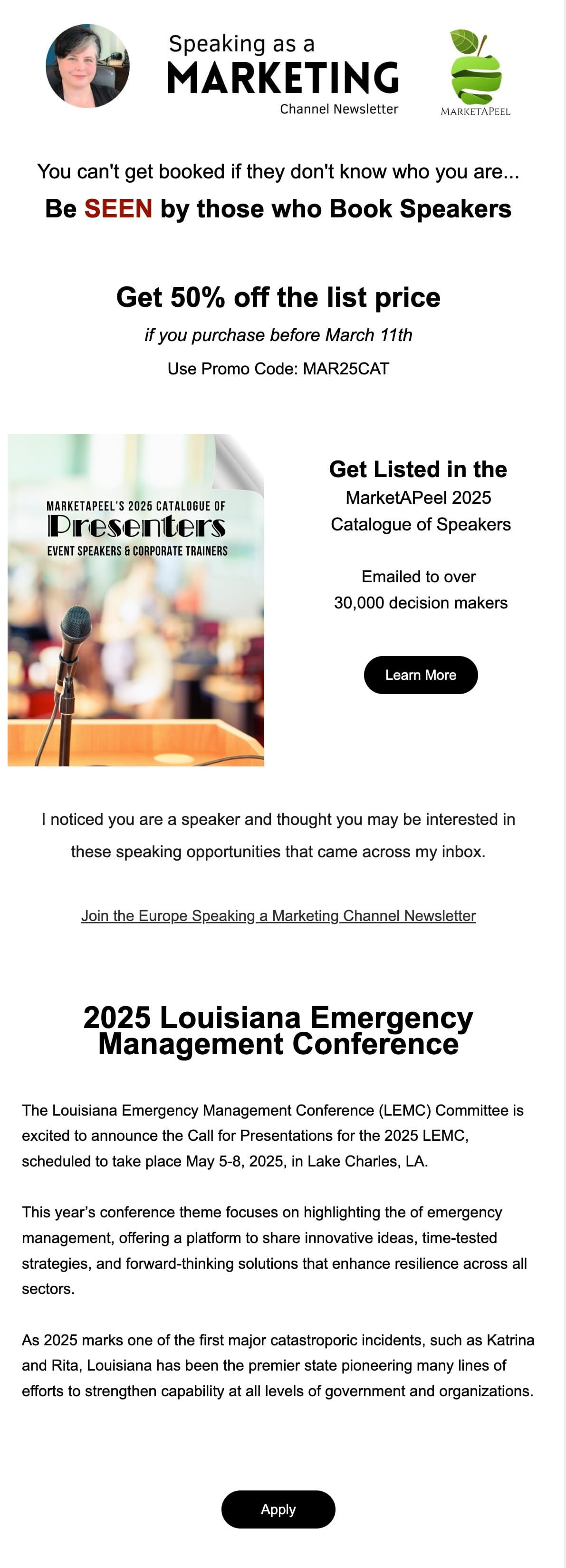 First, I need to state the obvious. MarketAPeel sends out a great email like this every week that lists three or four REAL events that are looking for speakers.